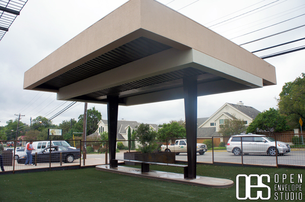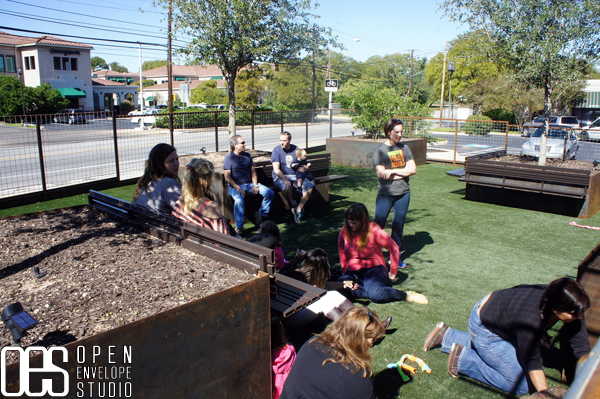 While fabricating all of these working parts was an exciting challenge for OES, there were a few speed bumps over the hot summer. Before we completed the fabrication of the planters and the oaks were installed to give off some shade, the ground plane was white and extremely reflective. It was like working in a desert! Also, when our build team began the project in May of 2013, many neighbors walking by would stop and ask questions about the nature of the business replacing the gas station. Matt often received the brunt of west Austin’s frustration that a pet shelter, not a restaurant, was coming up in its place. OES was even featured in a local neighborhood newspaper, the article’s author confusing OES with the Garden Design Studio as one company, with unintentionally hilarious quotes by our team. My favorite line was from James Fitzgerald, closing out the article saying, “It’s not the end of the neighborhood…and definitely not the end of the world.”