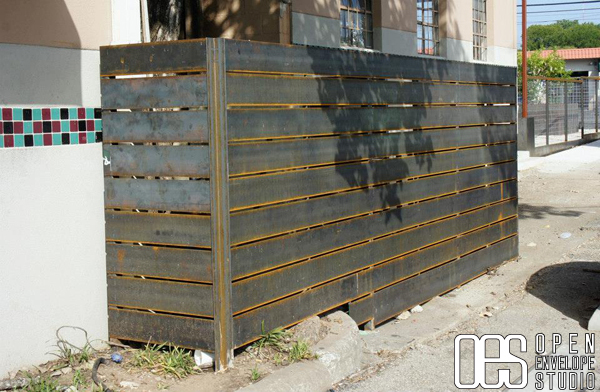 This summer, we’ve had the pleasure of working on all of the steel elements at the Austin Pets Alive! at 3108 Windsor Road. It was our largest project to date, the most complex, and we couldn’t be more pleased with the results and details. We were subbed out by the owner/landscape architect of the Garden Design Studio, Bill Bauer, who asked us to fabricate large planters, hanging and standing benches, bollards, a front bull panel fence, a back horizontal slat fence, a trellis, and awning, all in steel.