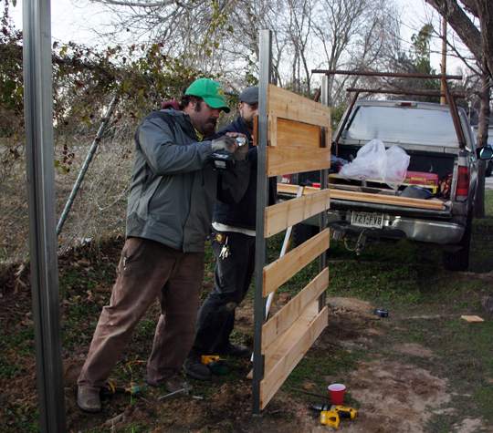 This day was much colder than it had been, so Matt was a human popsicle he stood holding each post while it set. I know this because he kept asking me for hand and foot warmers. It’s rough if you can’t move around to warm up. One of the clients took off work the rest of the week to be the third man on the job. He, Matt, and Shawn were able to finish the posts on other two sides of the yard. They were also able to put up the first panel. One guy cut the cedar planks to length, while the other two held up and screwed in the plank with a jig to make even spacing. Since this was the only panel with concrete that had set fully, and it was pretty much night time, they called it a day.