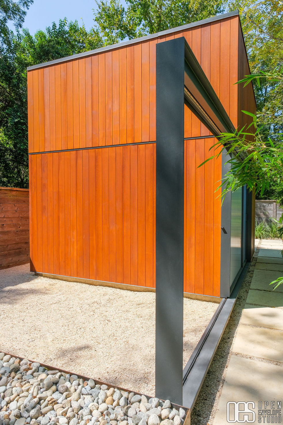The workshop is a single volume bisected by a horizontal plane that provides a datum for material changes and fenestration alignments. The interior is a 12’ x 12’ flex space with an operable divider. The exterior has minimal openings that are graciously-sized to allow natural daylighting. The sliding door opens to a framed view of clumping bamboo and provides ample fresh air. The material pallet is simplistic and casual and provides a softly colored pallet for daily activities.